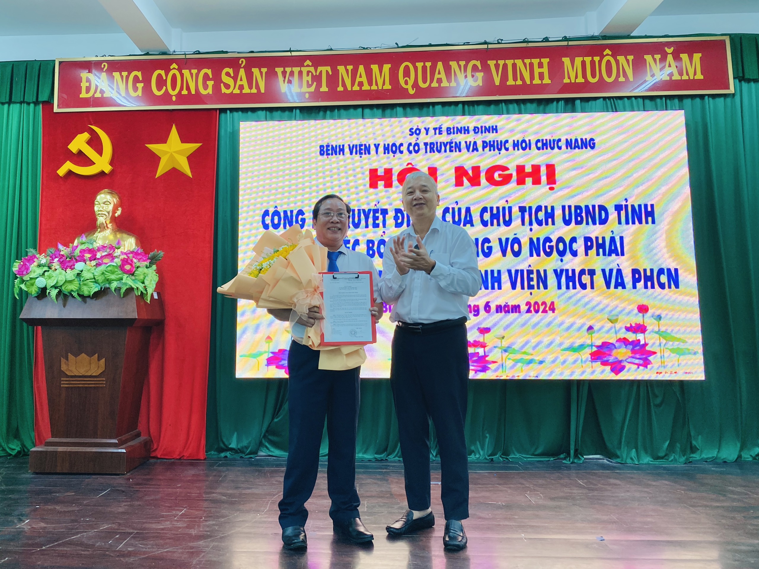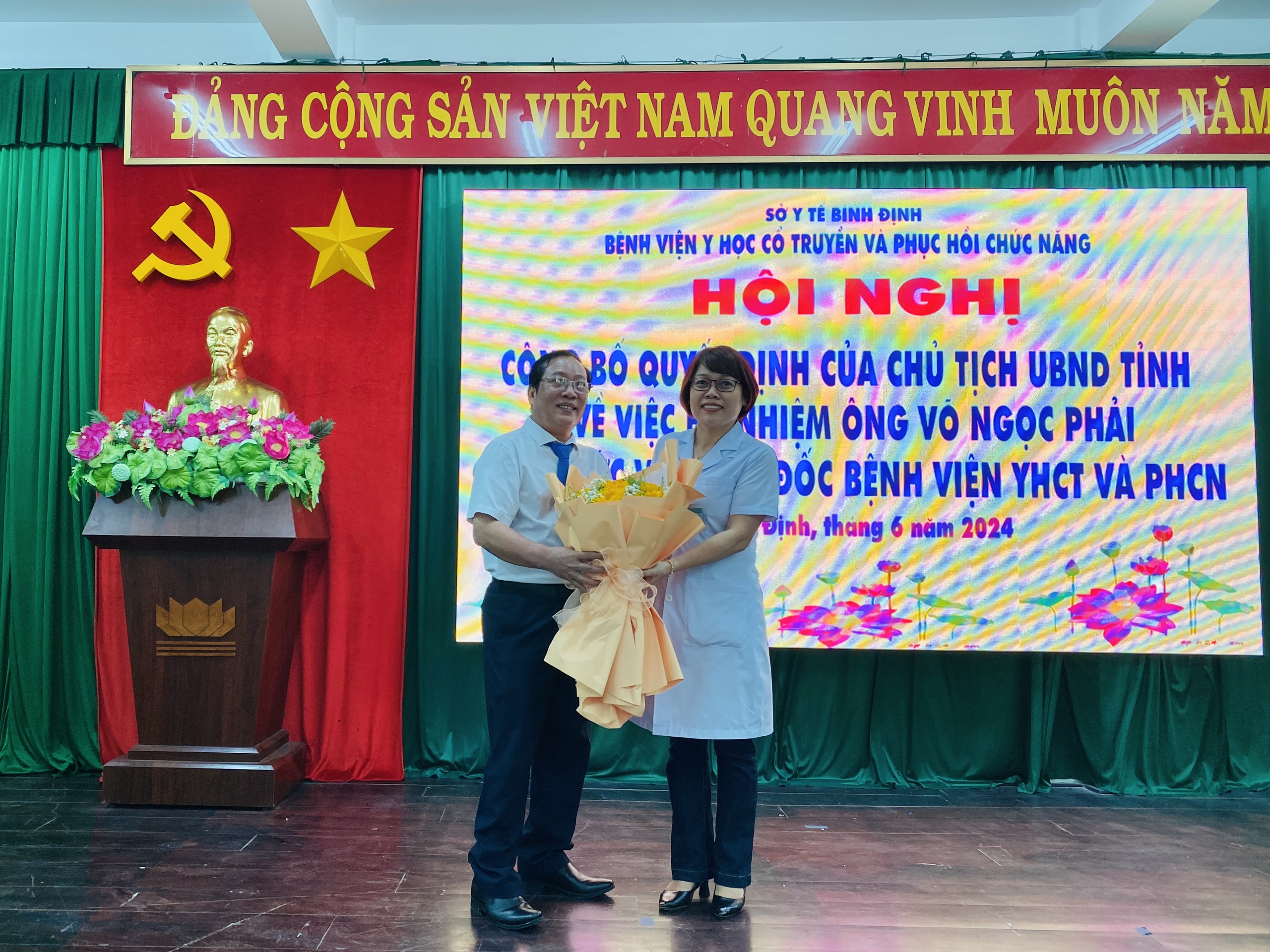 Sáng ngày 24/6/2024, tại Bệnh viện YHCT và PHCN Bình Định, Đại diện lãnh đạo Sở Y tế Bình Định đã trao quyết định của Chủ tịch UBND tỉnh Bình Định bổ nhiệm ông Võ Ngọc Phải giữ chức vụ Giám đốc Bệnh viện YHCT và PHCN trong thời hạn 05 năm, kể từ ngày 21/6/2024.