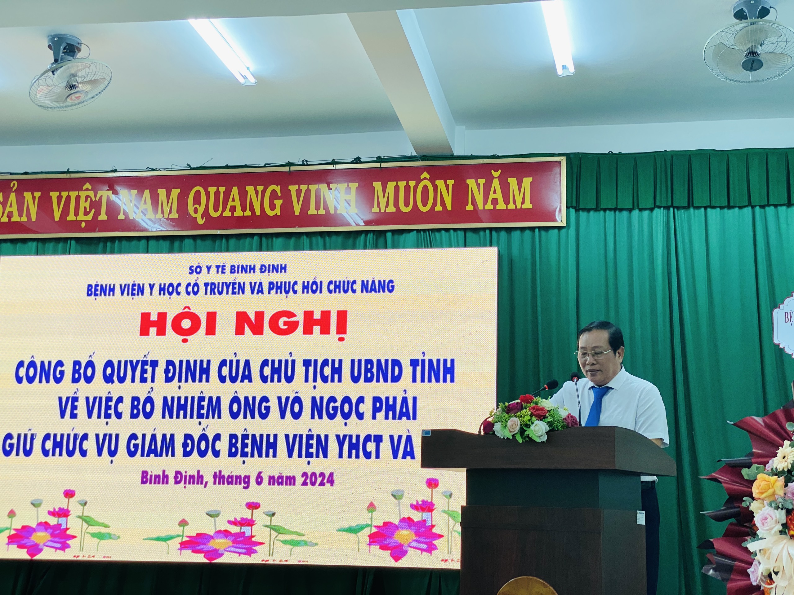 Thay mặt lãnh đạo UBND tỉnh Bình Định, đ/c Lê Quang Hùng đã trao quyết định bổ nhiệm chức danh Giám đốc Bệnh viện YHCT và PHCN cho đ/c Võ Ngọc Phải và bày tỏ sự tin tưởng với cương vị mới BS.CKI Võ Ngọc Phải sẽ phát huy năng lực, trí tuệ, sự sáng tạo, nhiệt huyết và khả năng chuyên môn cùng tập thể lãnh đạo, nhân viên Bệnh viện để hoàn thành tốt nhiệm vụ, góp phần nâng cao chất lượng khám chữa bệnh, phục vụ nhu cầu chăm sóc và bảo vệ sức khoẻ cho nhân dân.